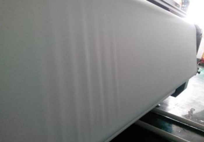 軟膜起皺分為兩類(lèi),一類(lèi)為著墨受熱后變形產(chǎn)生,一類(lèi)為材料為拉伸平展而產(chǎn)生。對(duì)于此兩類(lèi)起皺情況,其褶皺是在噴印固化之后出現(xiàn),隆起部分并不嚴(yán)重,并且很快移除打印區(qū)域,不會(huì)造成噴嘴刮擦,也不會(huì)影響正常打印,所以此兩類(lèi)起皺不做處理。