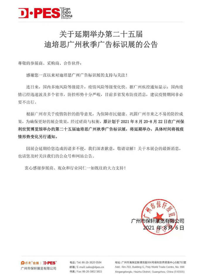 根據(jù)廣州市關(guān)于疫情防控的指導(dǎo)意見,為保障市民健康、鞏固廣州市來之不易的防控成果,為確保更好的展會效果,主辦方?jīng)Q定原計劃于2021年8月20-8月22日在廣州保利世貿(mào)博覽館舉辦的第二十五屆迪培思廣州秋季廣告標(biāo)識展,將延期舉辦,具體時間將視疫情形勢變化另行通知。