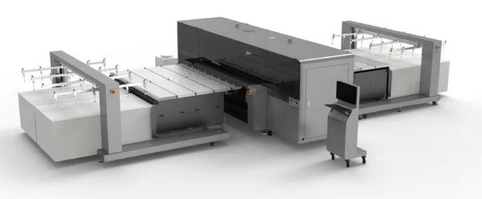 漢拓?cái)?shù)碼即將在FESPA 2021展示的全自動(dòng)上下料HT2500ROBO卷板一體高速UV打印機(jī)將解決這個(gè)難題。在行業(yè)內(nèi)應(yīng)用全新的自動(dòng)上下料方案,通過上料+印刷+下料的環(huán)節(jié)聯(lián)結(jié),大幅度地減少人工并縮短上下料時(shí)間,最大化提升印刷廠的生產(chǎn)效率。從目前來看,HT2500ROBO最高產(chǎn)能達(dá)到了312㎡/h,其自動(dòng)上板的產(chǎn)能接近于人工操作10臺(tái)HT2512UV平板打印機(jī)(漢拓?cái)?shù)碼十年暢銷海外的經(jīng)典平板機(jī)型)的產(chǎn)能。