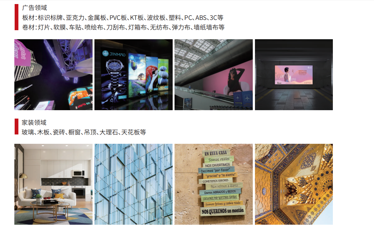 軟膜、刀刮布、車貼等常見(jiàn)卷材,PVC、木板等板材